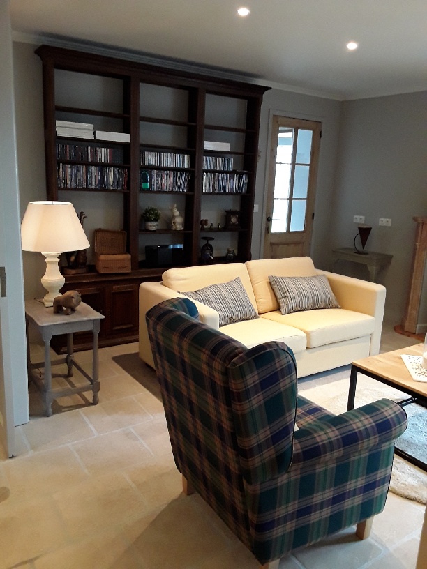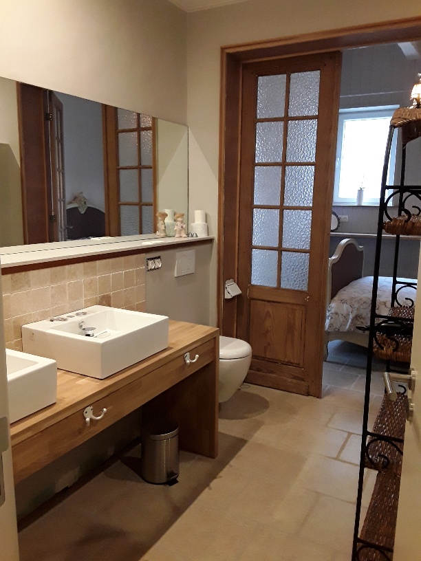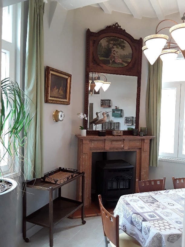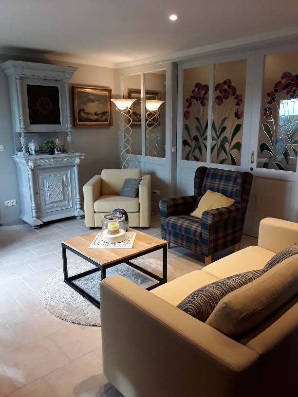 Een pittoresk deurtje brengt ons in de ruime gezellige leefruimte met een oude marmeren schouwmantel en grote eiken schuifdeuren voorzien van brandglas. Tevens is deze ook voorzien van tv en gratis Wifi en is geheel authentiek en smaakvol landelijk ingericht.